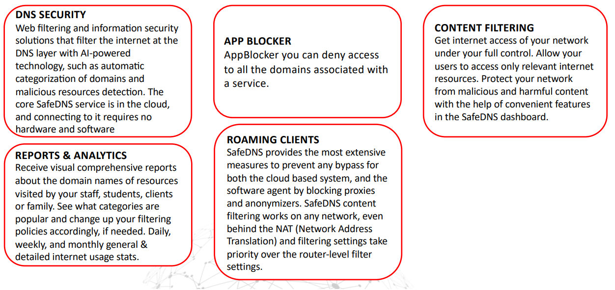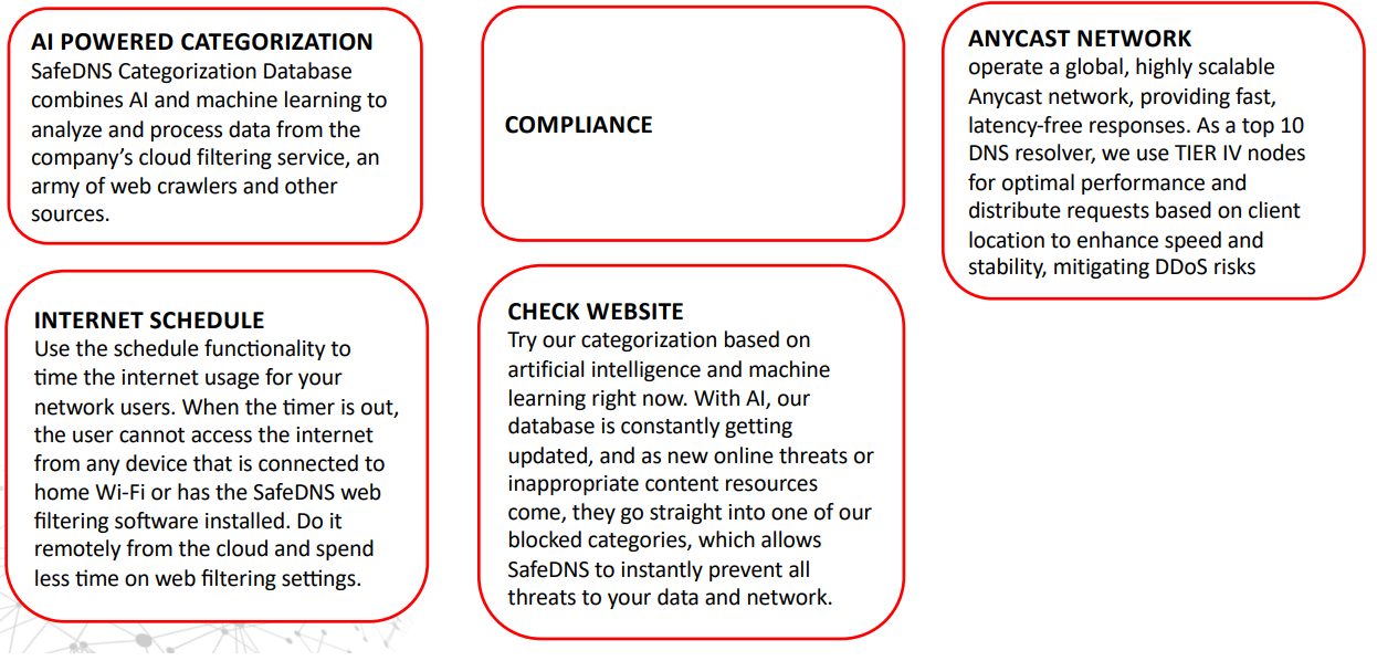 - SafeDNS delivers proactive security against zero-day threats with advanced AI and ML, blocking malicious activity at the DNS level before it can exploit the network.